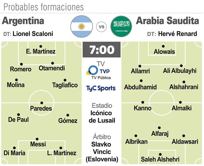 Del otro lado de la cancha esperará Arabia Saudita, equipo que tiene su sexta participación en mundiales y cuyo entrenador, el francés Hervé Renard, dijo: "En la Copa hay sorpresas y esa es la mentalidad que tiene el grupo. Nos encanta cuando se olvidan de nosotros y nos consideran el equipo más pequeño. Está justificado mirando el ranking FIFA", sostuvo.