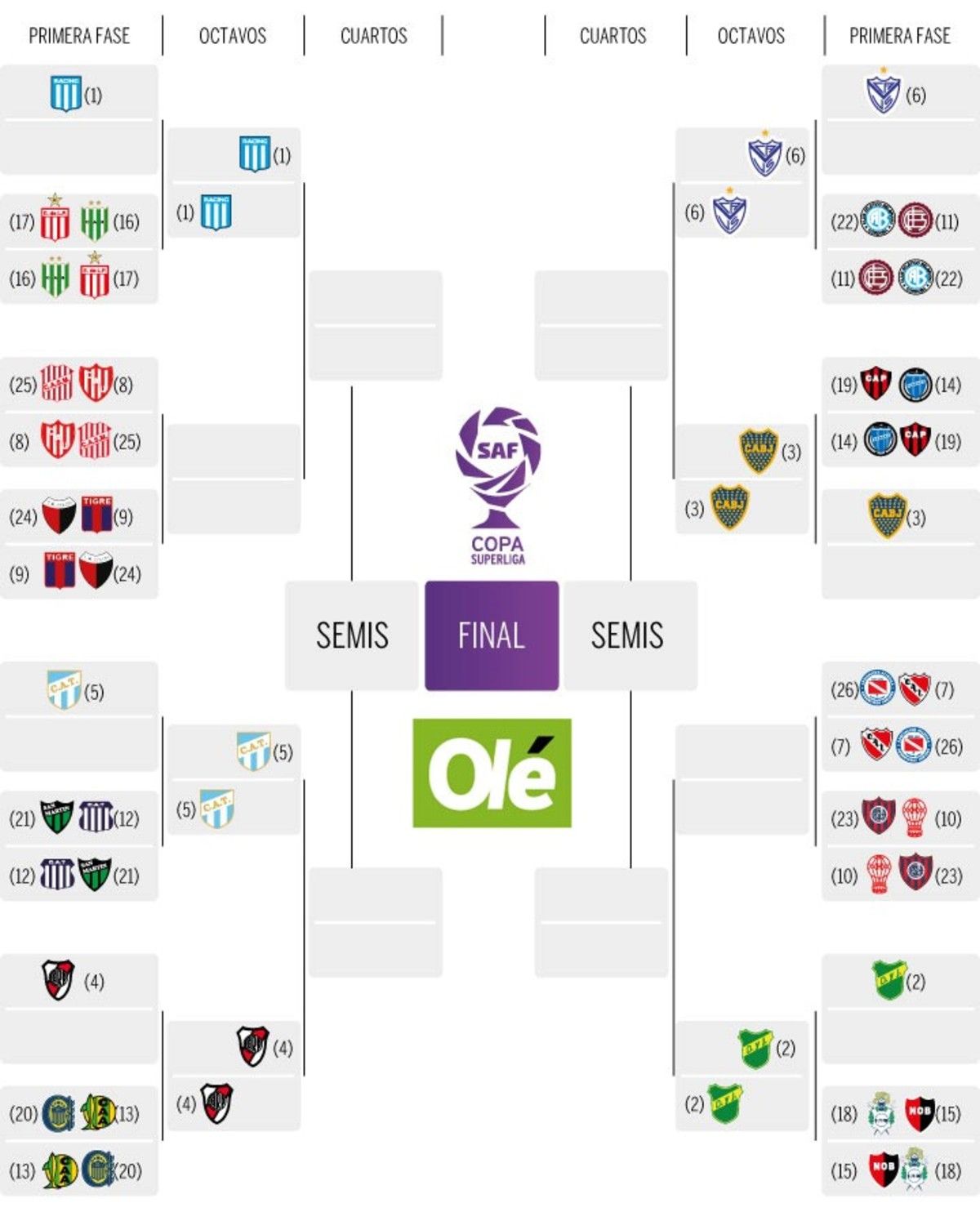 A primera vista, la llave de la derecha punta más competitiva y compleja que la otra. ¿Por qué? Porque de un lado están Boca, Independiente, Vélez, Defensa, San Lorenzo y Huracán (estos dos últimos más por ser grandes que por actualidad), mientras que del otro lado aparecen Racing, River y Atlético de Tucumán como los favoritos.