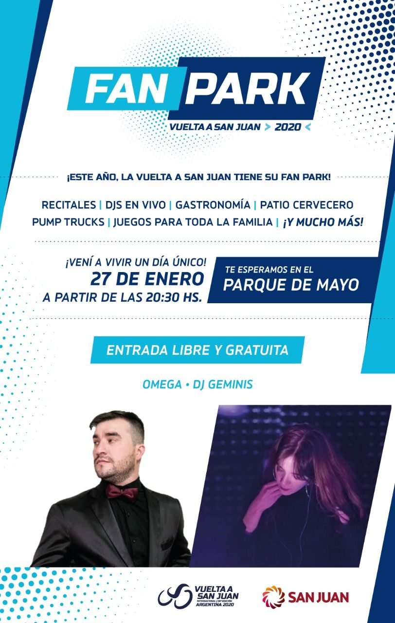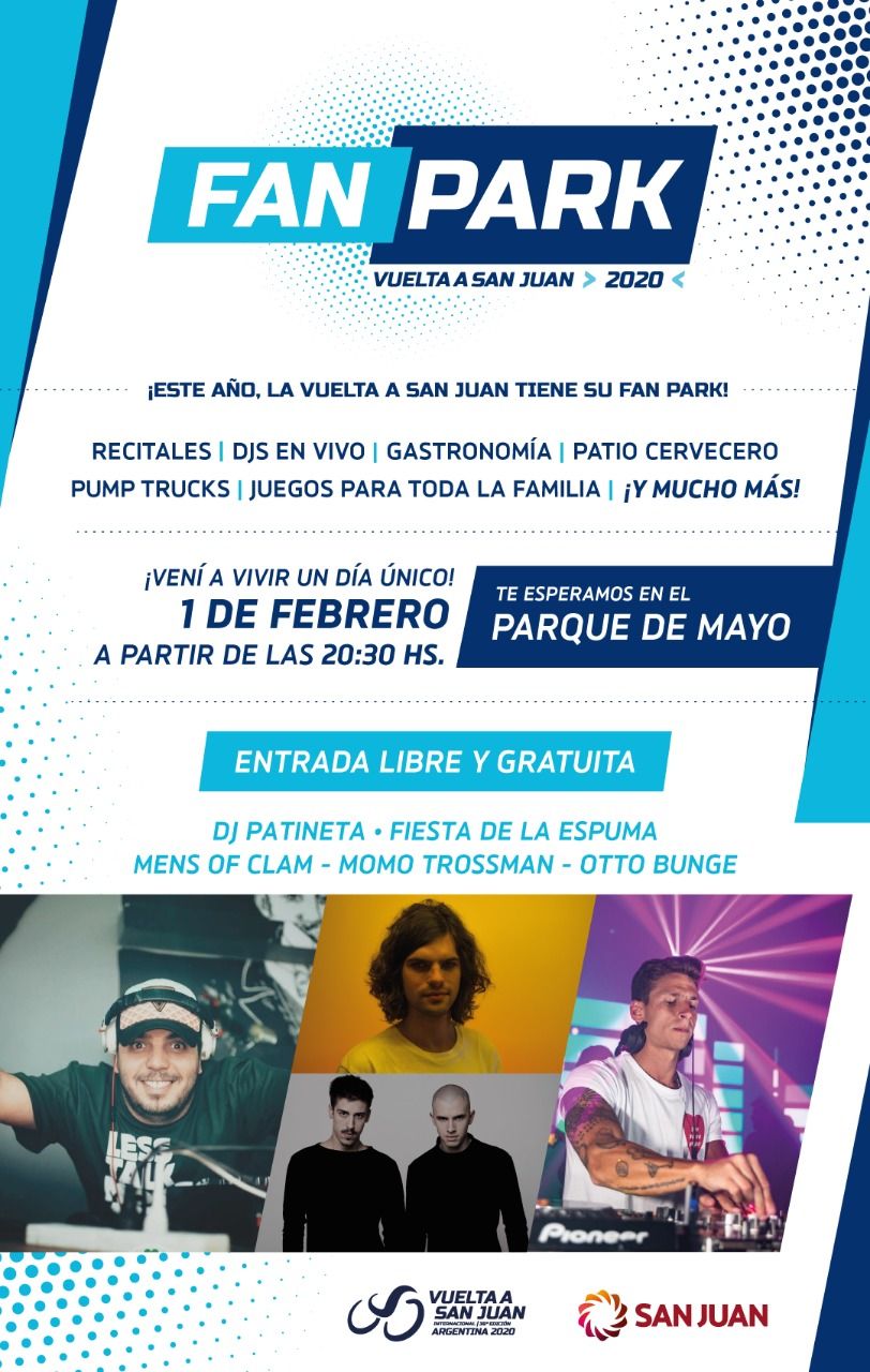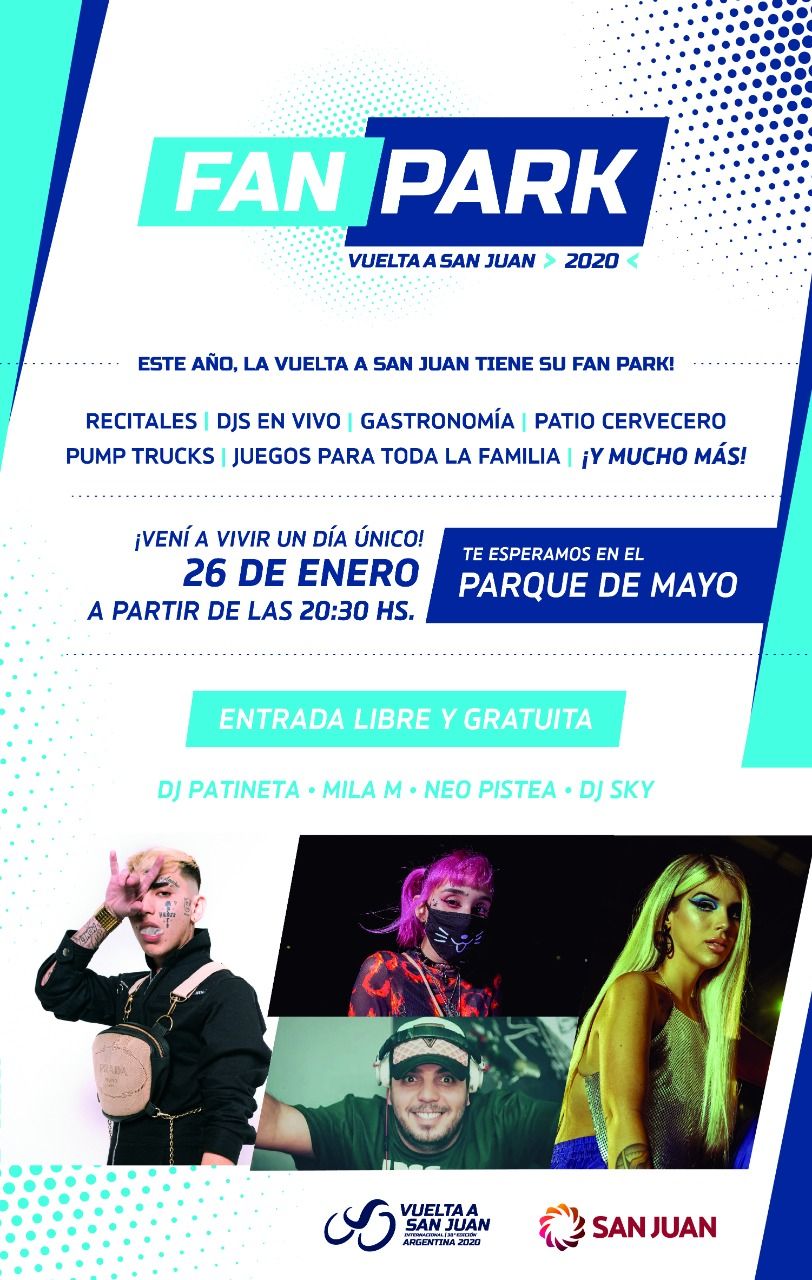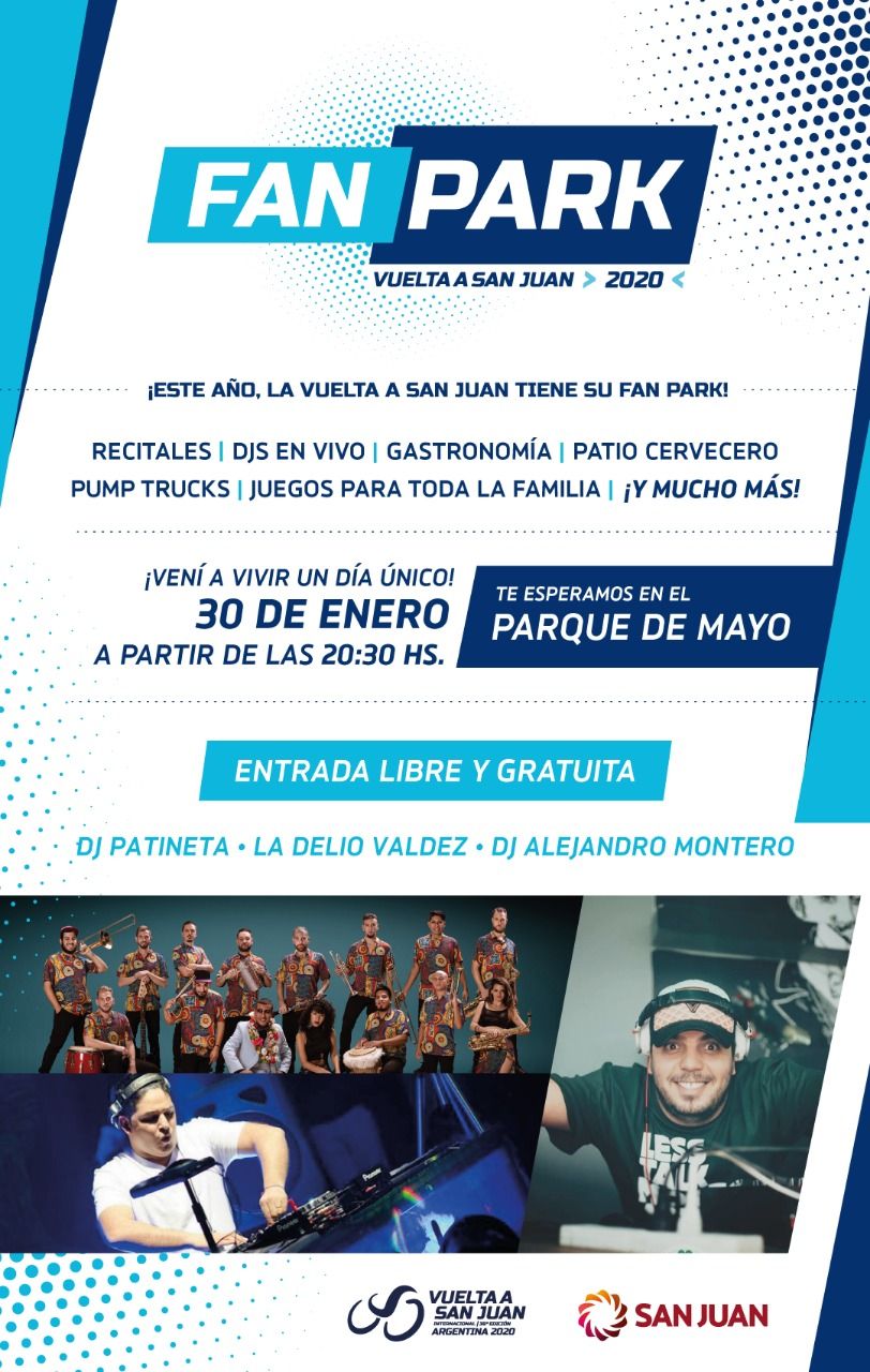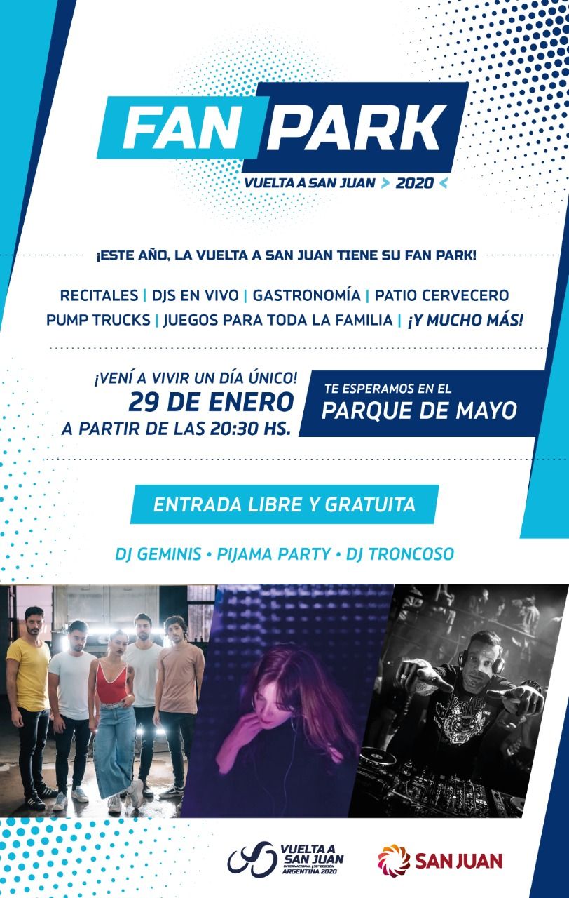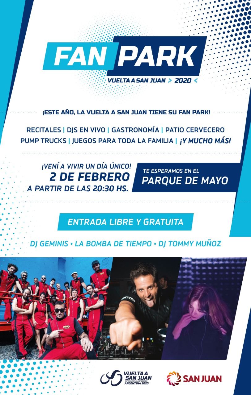 A partir de este domingo, el Parque de Mayo será el escenario de la diversión y las tardes de encuentro de la Vuelta a San Juan. Aquí la grilla de artistas que estará en la "Fan Park", que contará con gastronomía, patio cervecero, pump truck y juegos para toda la familia.