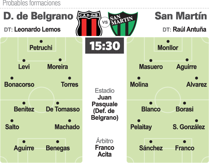En esa búsqueda, el técnico interino Antuña decidió cambiar mucho: modelo y nombres. Descartada la línea de tres en el fondo, San Martín será clásico en defensa con la línea de cuatro que conformarán Masuero y Aguirre como centrales y el regreso a la titularidad de dos conocidos como Ale Molina y Dante Álvarez. En el medio, la fórmula vuelve a ser con cuatro: dos internos y dos externos. Aunque sin confirmación de todos los nombres, hay dos que son fija: Nico Pelaitay y Sebastián González. Lo demás, se definirá entre Blanco, Grahl y Borasi. Arriba, la fórmula sostiene a Nico Franco como punta más definido que su compañero Cristian Sánchez. Enfrente estará Defensores, que viene de caer en Zárate pero está prendido en las posiciones altas de la tabla.