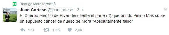 Además, el propio jugador se encargó, por medio de un tuit que realizó un periodista que sigue al equipo de Núñez se negar la información: "El Cuerpo Médico de River desmiente el parte (?) que brindó Pinino Más sobre un supuesto cáncer de hueso de Mora ´Absolutamente falso´", dice la publicación.