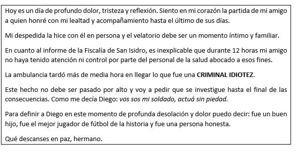 Para cerrar ”este momento de profunda desolación y dolor” agregó: “Fue un buen hijo, fue el mejor jugador de fútbol de la historia y fue una persona honesta. Que descanses en paz, hermano”.