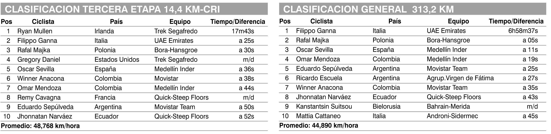 De los argentinos el mejor registro fue el de Eduardo Sepúlveda. El chubutense debutante en el Movisar español culminó noveno, a 50s del irlandés y saltó al quinto puesto de la clasificación general. Quien terminó tercero en la etapa y quedó segundo en la carrera, ratificando su condición de favorito para quedarse con la victoria el domingo es el polaco Rafal Majka (Bora-Hansgrohe). Ricardo Escuela (Agrupación Virgen de Fátima) hizo el 13er tiempo y quedó sexto a 27s, en tanto que el español Oscar Sevilla y el colombiano Omar Mendoza, del Medellín Inder, saltaron al tercer y cuarto puesto por lo que darán dura lucha a cualquiera que pretenda convertirse en el monarca de la competencia que sigue abierta y emocionante.