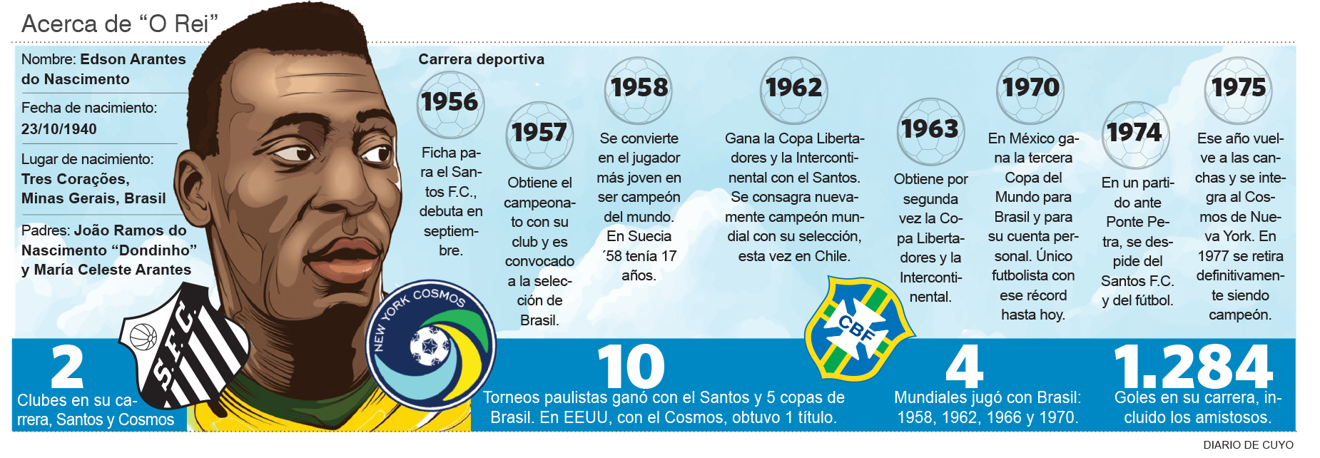 Pelé había nacido el 23 de octubre de 1940 en Minas Gerais y debutó como futbolista profesional en 1956 en Santos, de San Pablo, donde jugó hasta 1974. El otro club por el que pasó fue el Cosmos, de Estados Unidos, entre 1975 y 1980. Fue tricampeón del mundo: ganó la Copa en Suecia 58, Chile 62 y México 70, esta última con un equipo que, para muchos hinchas del planeta, fue el mejor de toda la historia.