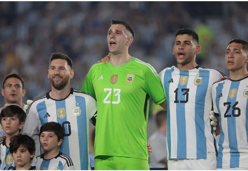Junto a él estuvieron Thiago, Mateo y Ciro que encabezaron el grupo de los hijos e hijas que acompañaron a sus padres en uno de los momentos más emotivos de la noche. A un costado de la cancha, el entrenador Lionel Scaloni también se emocionó y cantó con fuerza el himno acompañado de sus hijos Ian (11) y Noah (6).