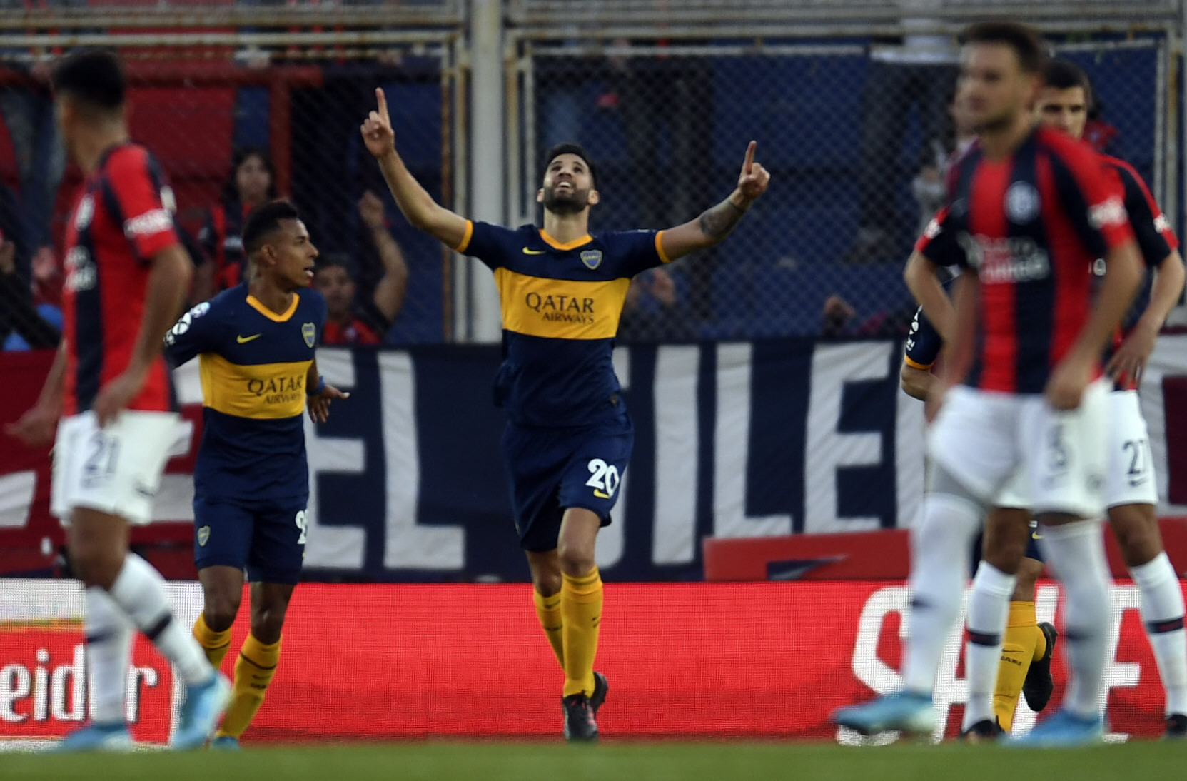 LA LLAVE. "Licha" López ya anotó su gol y celebra mirando al cielo. Boca aplicó su juego en el Nuevo Gasómetro y continúa dominando en el certamen. La victoria fue clave para sus aspiraciones de seguir dominando la Superliga.