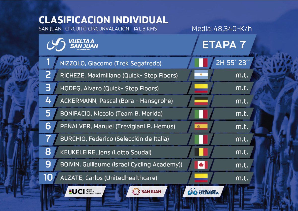 El pedalero jujeño, de 24 años, alcanzó la gloria luego de brillar en la quinta etapa y de mantener la diferencia lograda en los dos últimos parciales (la ida y vuelta a la Difunta Correa y el recorrido en la Circunvalación), registrando un tiempo total de 21 horas, 59 minutos y 6 segundos. Fue seguido por el español Oscar Sevilla, del Medellín (a 51 segundos) y por el italiano Filippo Ganna, del UAE Team Emirates (a 1’ 11’’).