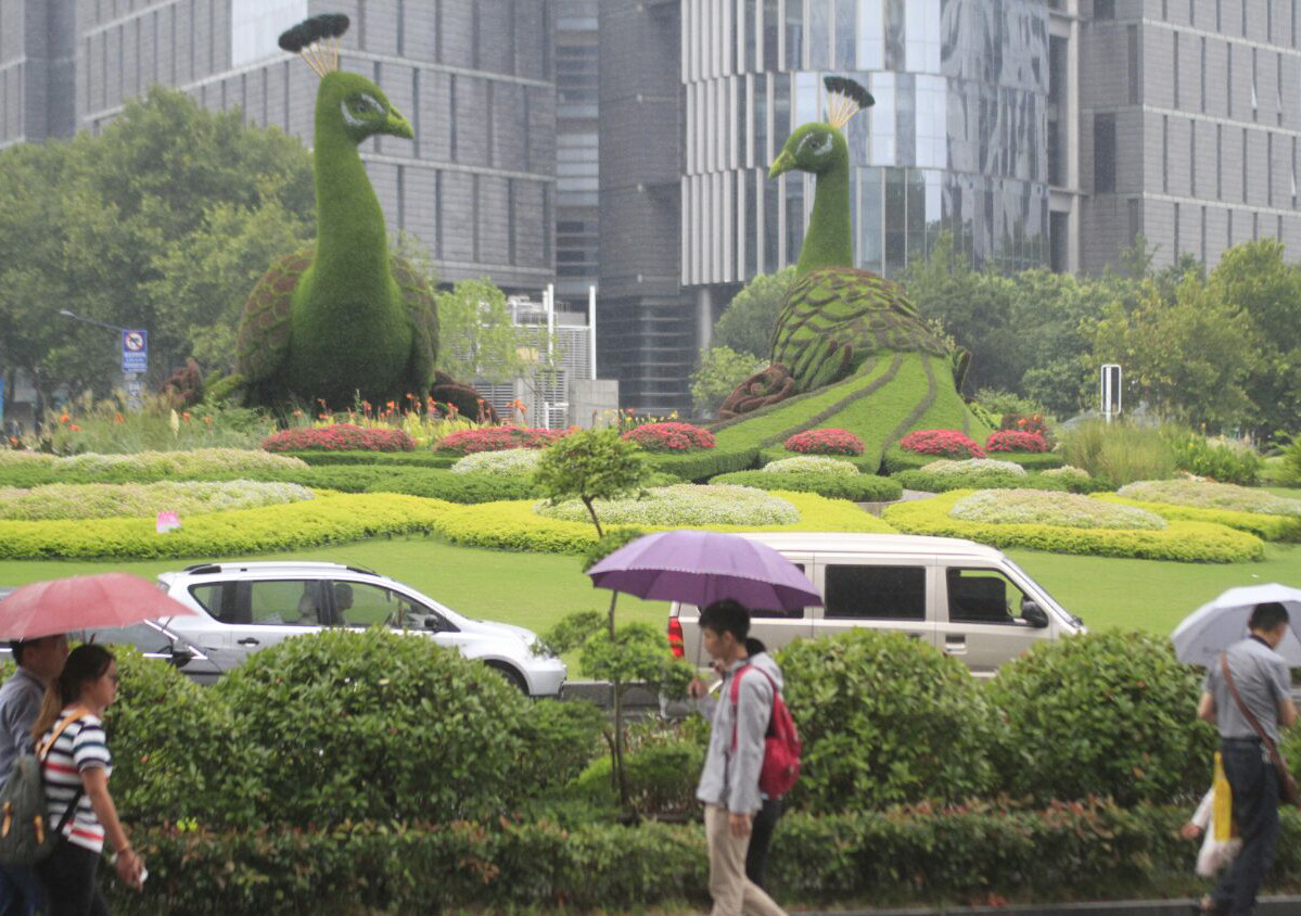 Y los chinos aprovechan ese verde al máximo y realizan verdaderas esculturas naturales en las plantas. Hay dos plazoletas que muestran pavos reales gigantes (como lo muestra la foto). Están tan bien hechos en los ligustros que parecen las aves de verdad. Hay otras aves siempre trabajadas en ligustrines o plantas más comunes. Por ejemplo, a la salida de un parque se pueden ver unos bellos cisnes (también en la foto). Y en otros lugares hay patos. En realidad, todo cuidado con pulcritud y tratado con buen gusto.