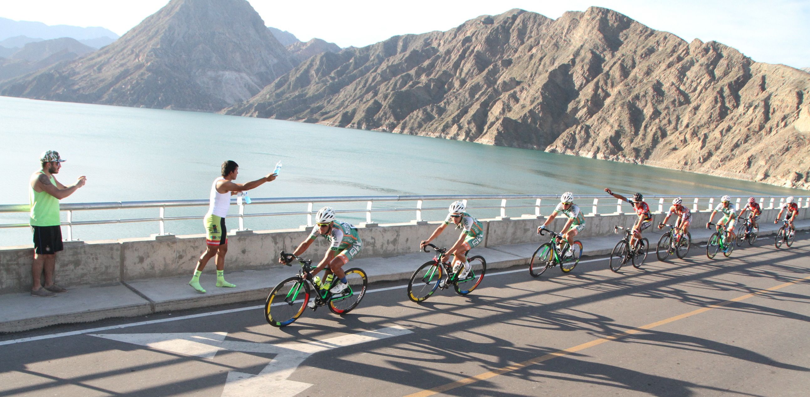 Paredón, por paredón. Antes todas las imágenes para ‘encuadrar’ del ciclismo eran en la cima del paredón del Dique de Ullum. Ahora, con Punta Negra terminado tienta jugar con la gama de colores que dan las montañas y el lago de fondo con el enjambre multicolor transitando por la cinta asfáltica. Mucho público acudió a la zona previa (los caracoles) para ver la carrera.
