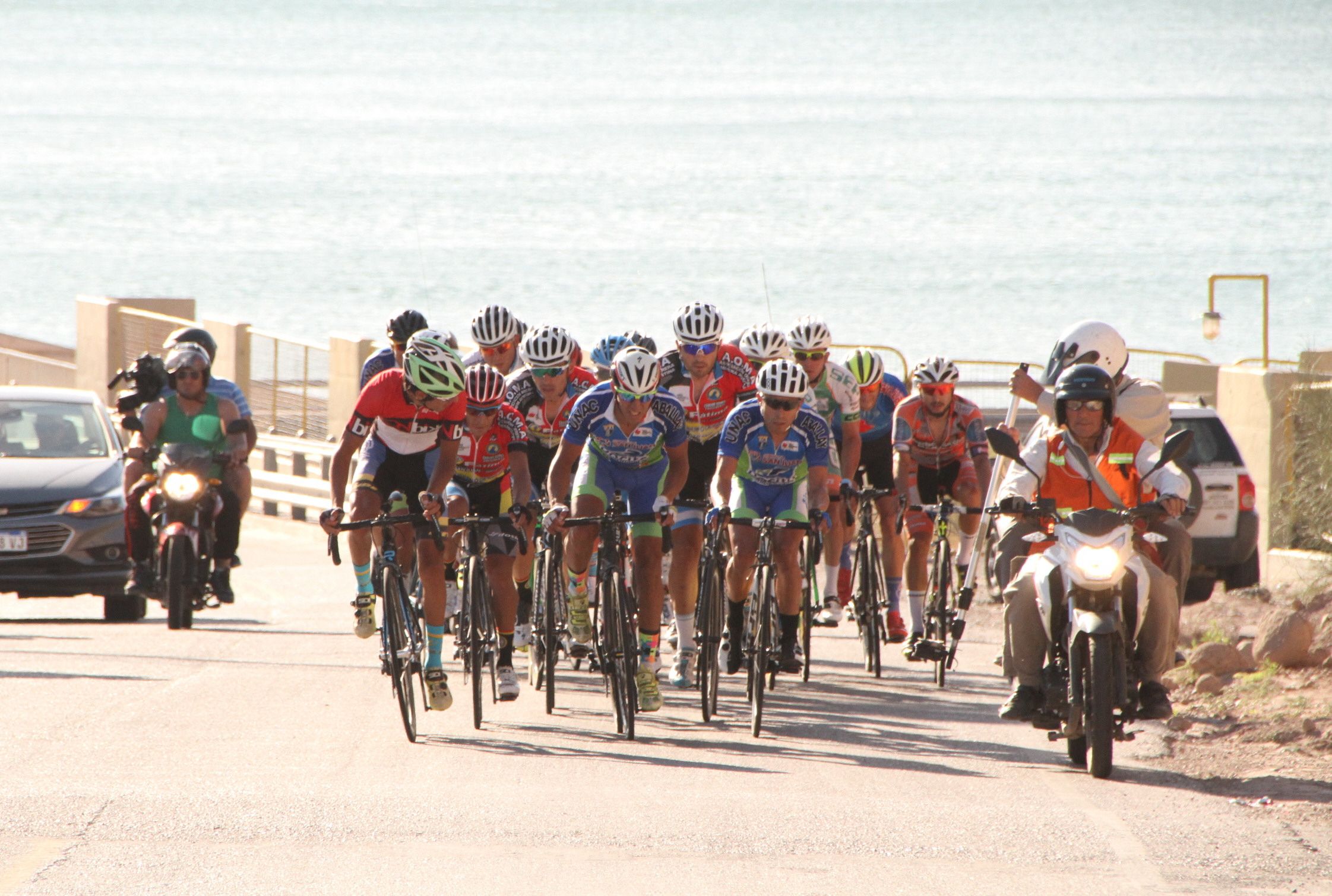 El pelotón de punta deja el paredón del Dique de Ullum, con el espejo de agua a sus espaldas y comienzan los movimientos de los más duros para romper la carrera. Allí fue cuando algunos se levantaron de sus sillines e imprimieron un ritmo firme con el fin de seleccionar el grupo. Lograron su meta por pocos kilómetros.