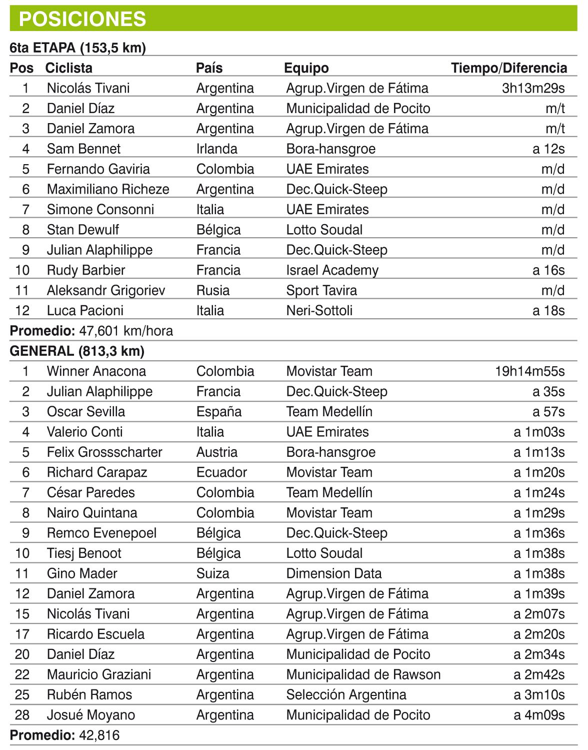 Después de levantar el brazo derecho cuando estuvo seguro de su victoria, recibió el cálido cariño de la gente que bajó de las gradas y explotó. Se apoyó sobre el manillar y no pudo contener sus lágrimas. Nicolás Tivani, quien estaba muy ilusionado de continuar su campaña profesional en Europa luego de correr tres pruebas, en las que no desentonó, como "stagieri" en el UAE Emirates, consiguió dar un campanazo para que los representantes no se olviden de él. Ganó la sexta etapa de la Vuelta a San Juan y lo hizo de manera heroica. Lo suyo fue titánico para consolidar la escapada junto a Zamora, Díaz y Quintan y fantástico para definir en la llegada.