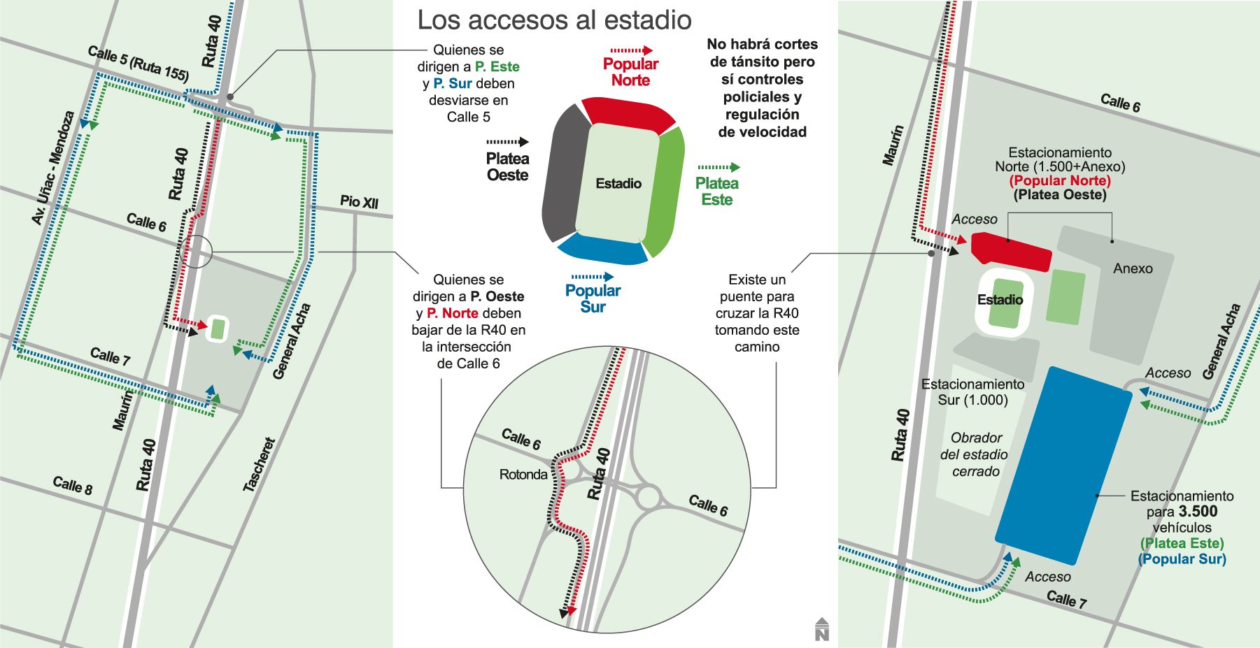 Para quienes asistan a la la Popular Sur y Platea Este podrán estrenar la nueva playa de estacionamiento de 3.500 vehículos. La misma está ubicada detrás de la cancha auxiliar y lindante al futuro velódromo que se encuentra en plena construcción. Al mismo se accede por calle General Acha. Otra alternativa puede ser por Ruta, pero deberán desviarse por calle 5 hasta llegar a General Acha. Para quienes asistan a la Popular Norte y Platea Oeste el ingreso será por calle 6 donde habrá un desvío para ingresar por colectora de Ruta 40 (ver infografía). Cabe destacar que cada boleto de estacionamiento cuesta 100 pesos y todavía están a la venta en las boleterías del Aldo Cantoni.