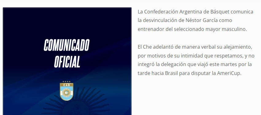“La Confederación Argentina de Básquet comunica la desvinculación de Néstor García como entrenador del seleccionado mayor masculino”, informó el organismo. Y aunque luego aseguran que “el Che adelantó de manera verbal su alejamiento”, los medios pudieron confirmar que se trató de un despido.
