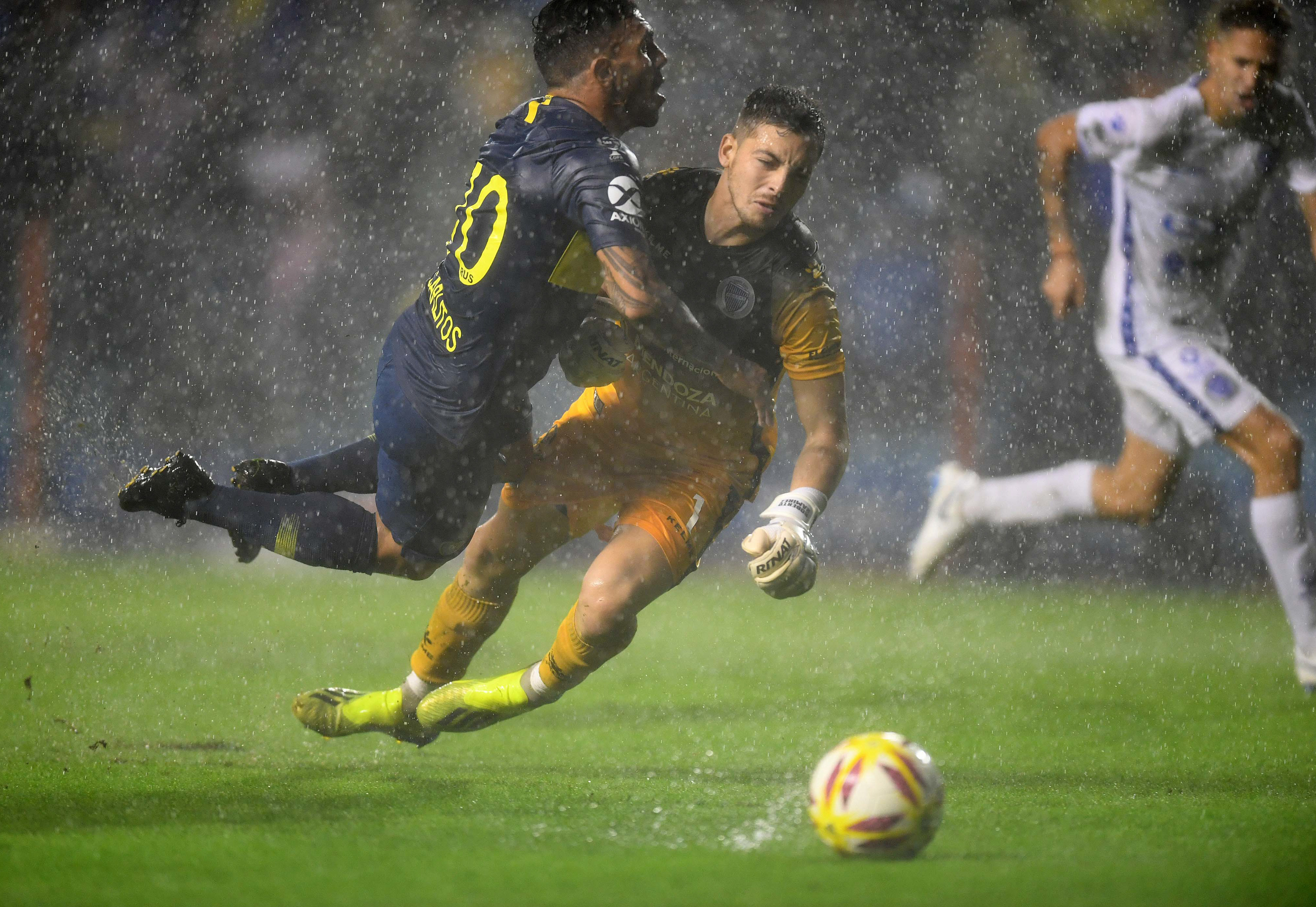 Con una alineación alternativa, Boca fue superior, aunque pasó varios momentos de zozobra ante los juveniles del ‘Tomba‘, sobre todo cuando el encuentro se desvirtuó por el agua acumulada. Pero Boca no perdonó en la primera oportunidad que tuvo: a los 5 minutos, usufructuó una pelota parada para ponerse 1-0. Almedra peinó un córner en el primer palo y ‘Wanchope‘ Ábila le puso su sello a la conquista. El gol motivó a los dueños de casa, que empezaron a mostrar sus mejores recursos: la movilidad de Tevez, las proyecciones de Weigandt, algunas pinceladas de Reynoso. A los 20, Godoy Cruz contó con una inmejorable chance de igualar: Merentiel, molestado por el cierre de Weingandt, falló de cabeza sobre la línea. La lluvia posteriormente sería un factor clave y el juego se suspendió transitoriamente.