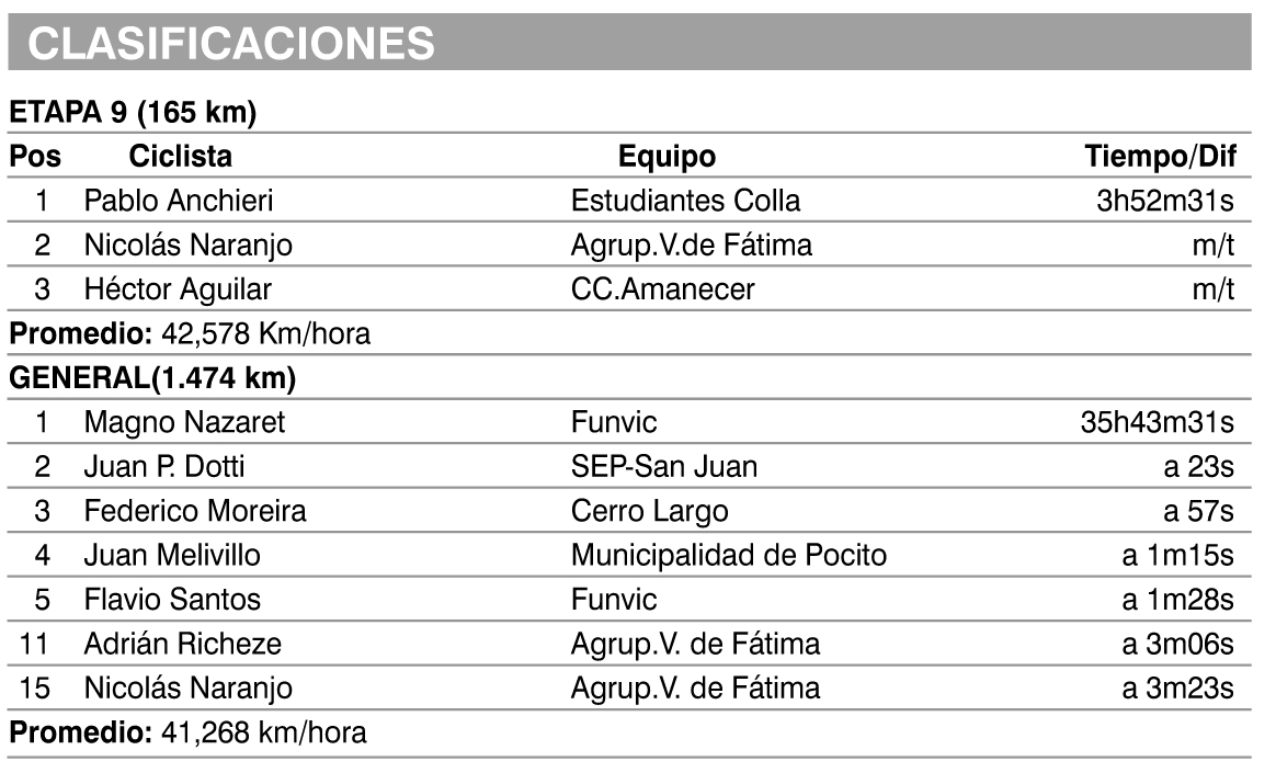 Tras el tramo que se definió en embalaje masivo, todo quedó igual. La carrera sigue siendo liderada por el brasileño Magno Nazaret (Funvic) escoltado por Juan Pablo Dotti (SEP-San Juan) a 23 segundos.