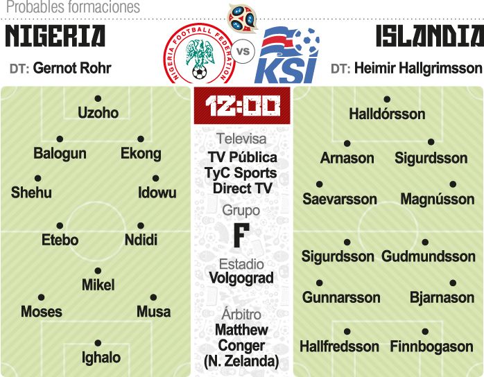 El seleccionado de Islandia, protagonista de una de las sorpresas de la primera fecha de la fase de grupos tras empatar con la Argentina (1-1), enfrentará hoy a Nigeria, que necesita sumar tras la derrota que sufrió ante Croacia en el Grupo D del Mundial de Rusia 2018. El encuentro se jugará a partir de las 12 en el estadio Volgograd Arena de la ciudad de Volgogrado.
