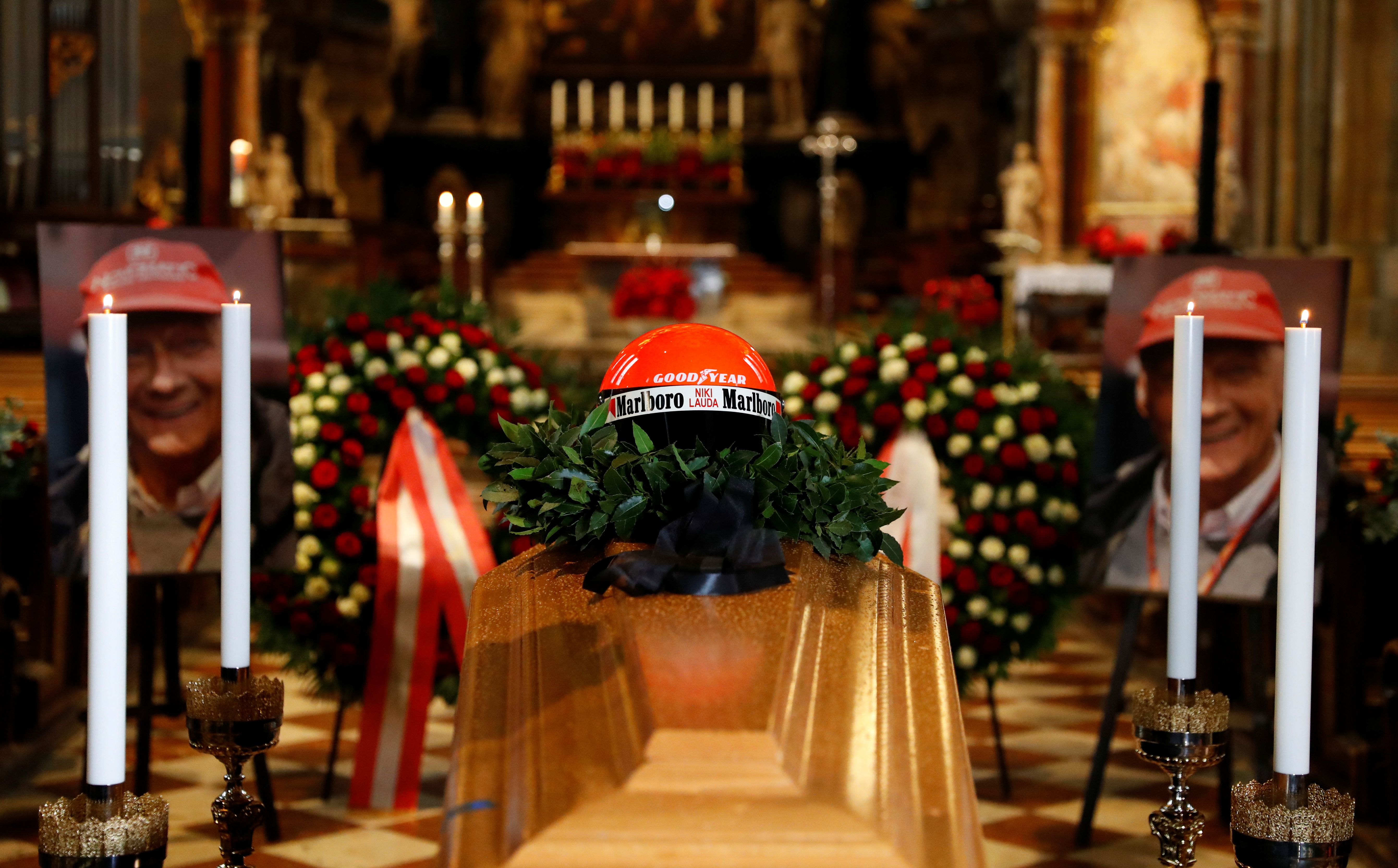 Capilla ardiente. El féretro con los restos de Lauda fue colocado en la Catedral de San Esteban. El expiloto fue vestido con su mono rojo; el casco lo colocó su hijo.