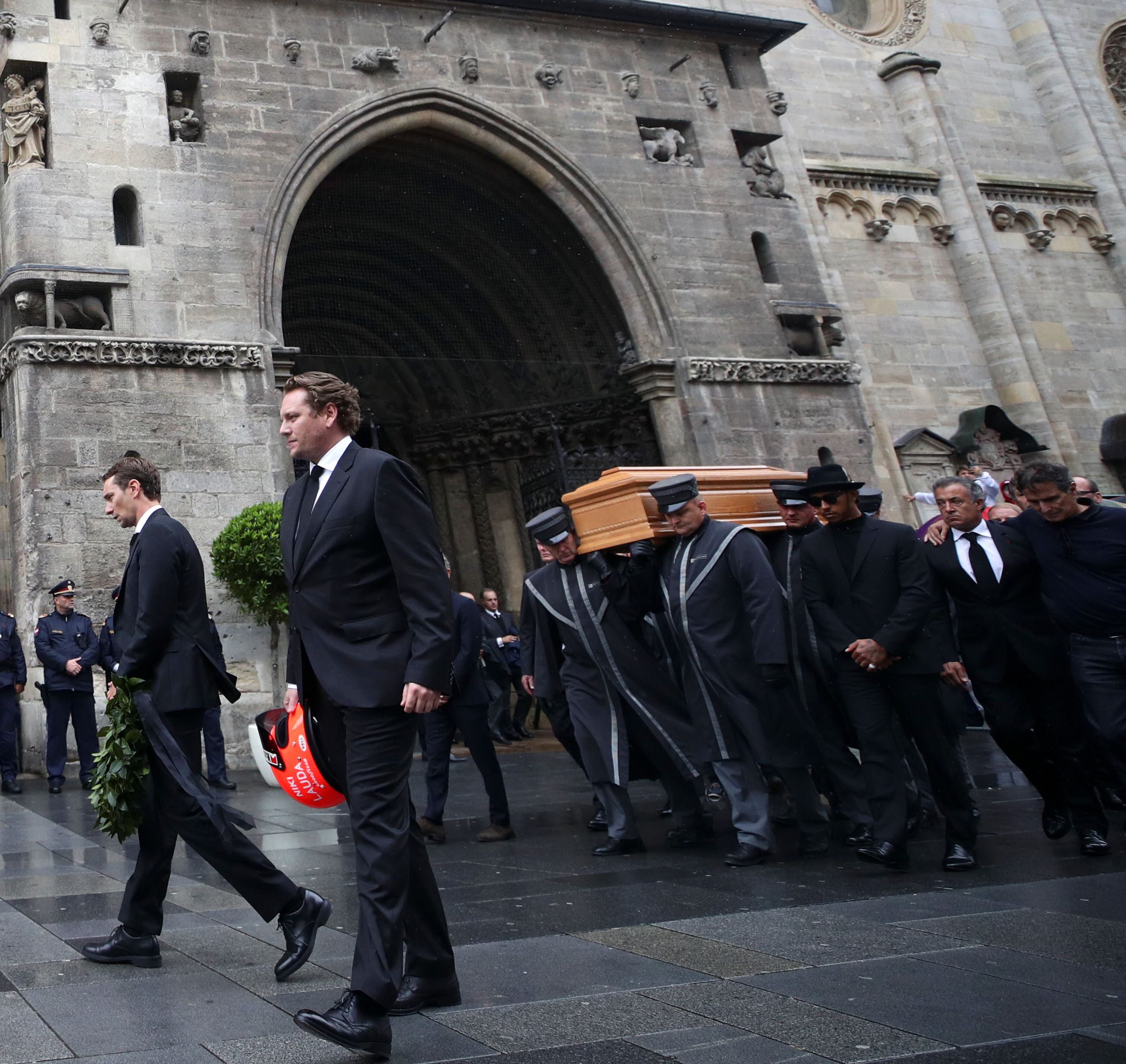 Poco después de las 8 de la mañana (hora local), el ataúd fue entrado en el templo acompañado de la viuda de Lauda, Birgit, y de Mathias y Lukas, sus dos hijos mayores nacidos del matrimonio del corredor con la chilena de origen austríaco Marlene Knaus.