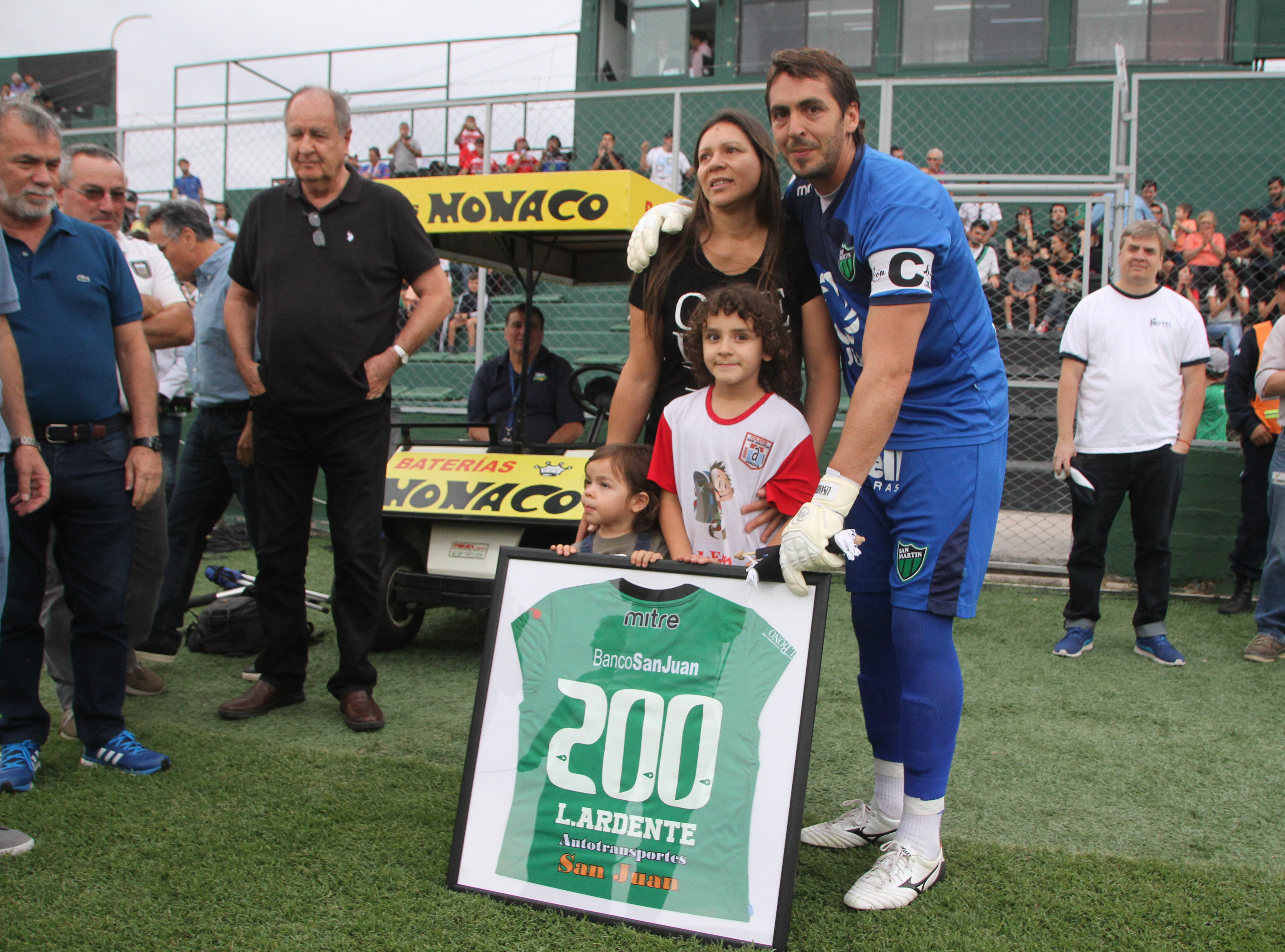 Merecida distinción. Es la que recibió en la previa del partido en el "Hilario Sánchez" el arquero y capitán del Verdinegro, Luis Ardente. Le entregaron, encuadrada, la camiseta del club con el Nro. 200 por haber cumplido esa cantidad de partidos en el club. La muestra orgulloso con su esposa e hijos.