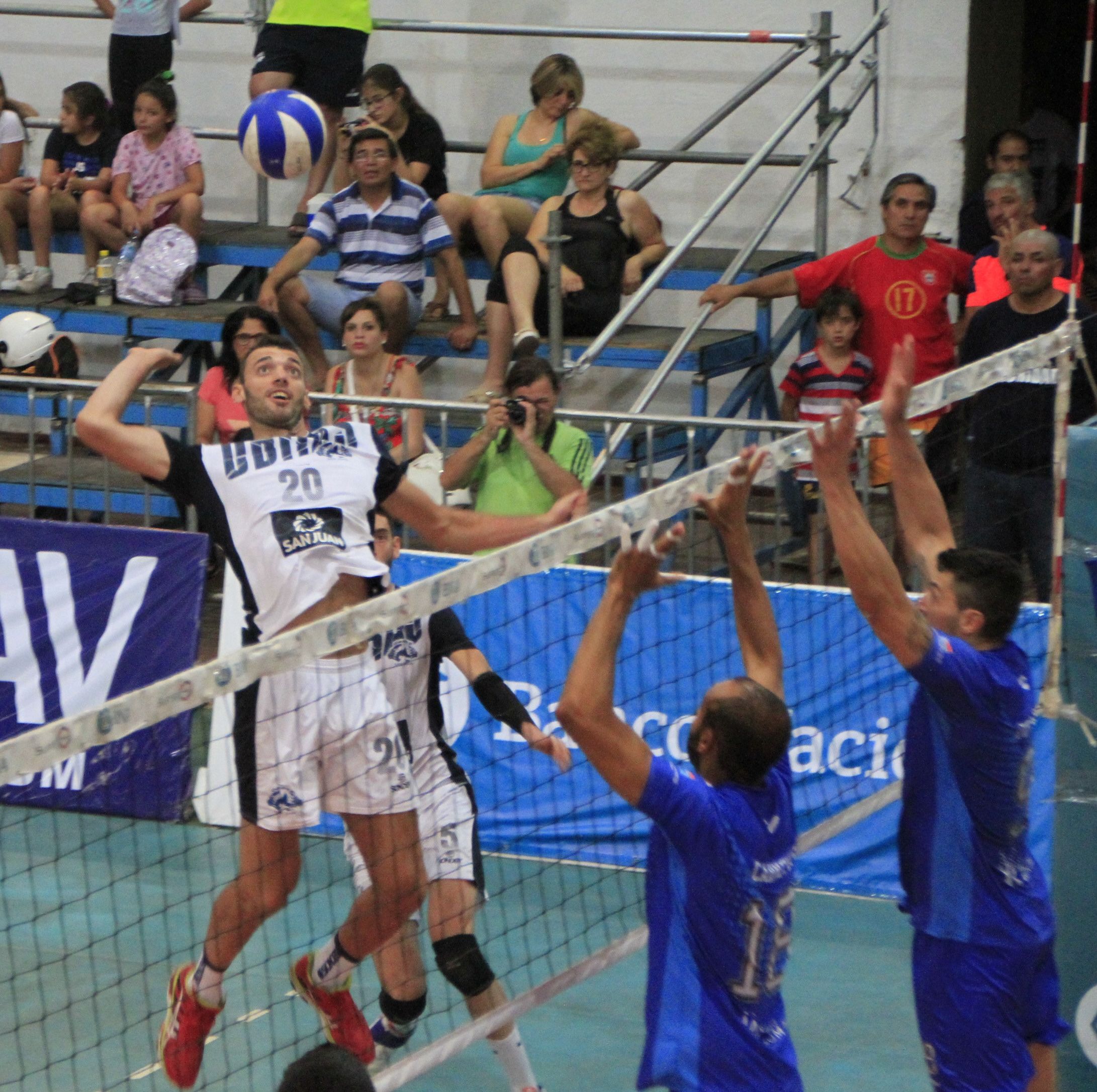 Al ataque. Maximiliano Scarpin ataca ante el bloqueo de dos ex Obras, Jonadabe Carneiro y Federico Pereyra. El equipo sanjuanino no tuvo una buena noche en el Ambrosini.