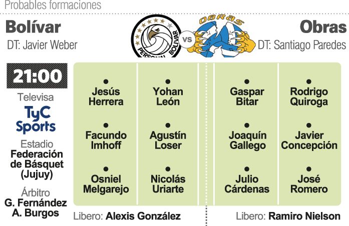 El encuentro se llevará a cabo en el estadio de la Federación de Básquet de Jujuy y será televisado por TyC Sports. Obras llegó el martes a la capital jujeña y siguió su plan de trabajo que buscar contrarrestar la falta de partidos amistosos, ya que si bien el plantel está a punto desde lo físico y lo técnico aún no tiene ritmo de partidos. En la otra vereda, Bolívar sí suma juegos de preparación y hasta viajó a Bolivia para disputar un cuadrangular internacional (salió campeón al superar al Fiat Minas de Brasil), además de haber sido el primer equipo en largar la pretemporada.