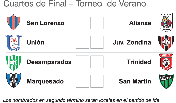 Los cruces serán Alianza-San Lorenzo, Zondina-Unión, Trinidad-Desamparados y San Martín-Marquesado, invirtiendo las localías en las revanchas. La Liga programará en forma expedita la serie de partidos para encarar el tramo decisivo de la temporada sanjuanina.
