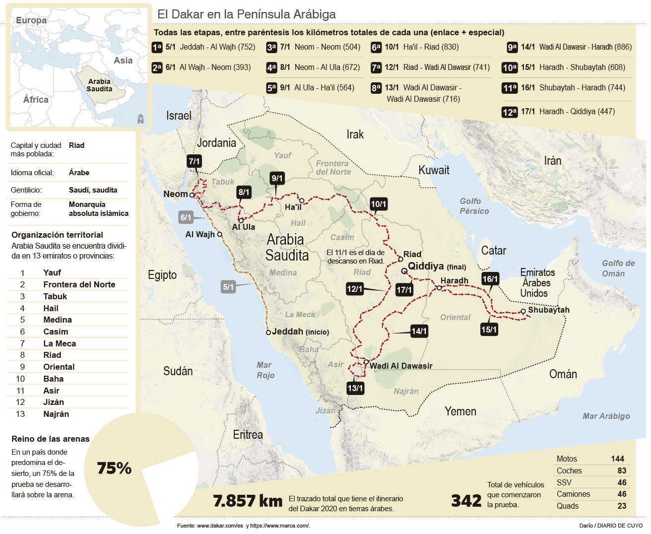 Mientras que hoy se disputará la tercera etapa con 489 kilómetros en total, teniendo salida y llegada en Neom. La particularidad es que será el tramo con mayor altitud del Dakar con 1.400 msm.