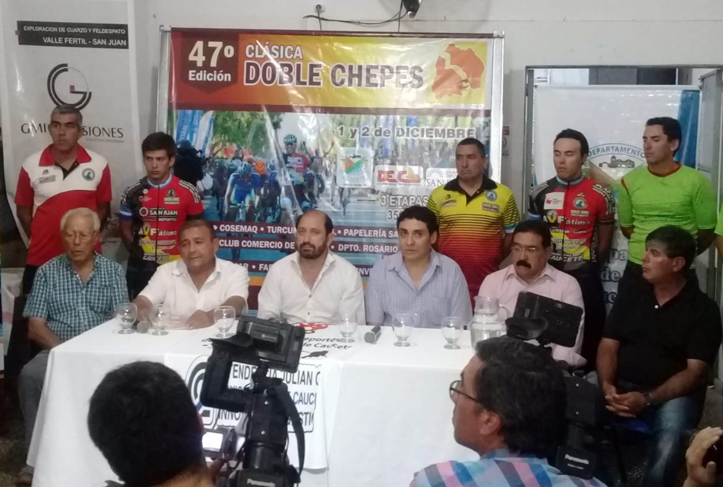 Con una reunión de prensa, desarrollada ayer en la explanada del palacio municipal de Caucete, fue presentada una nueva edición de la Doble Chepes; la que tendrá vida entre sábado y domingo próximos. El intendente Julián Gil, las autoridades del Caucete Pedal Club, junto a algunos integrantes del equipo de la Agrupación Virgen de Fátima, que cuenta con la comuna caucetera entre sus sponsors, departieron con la prensa.