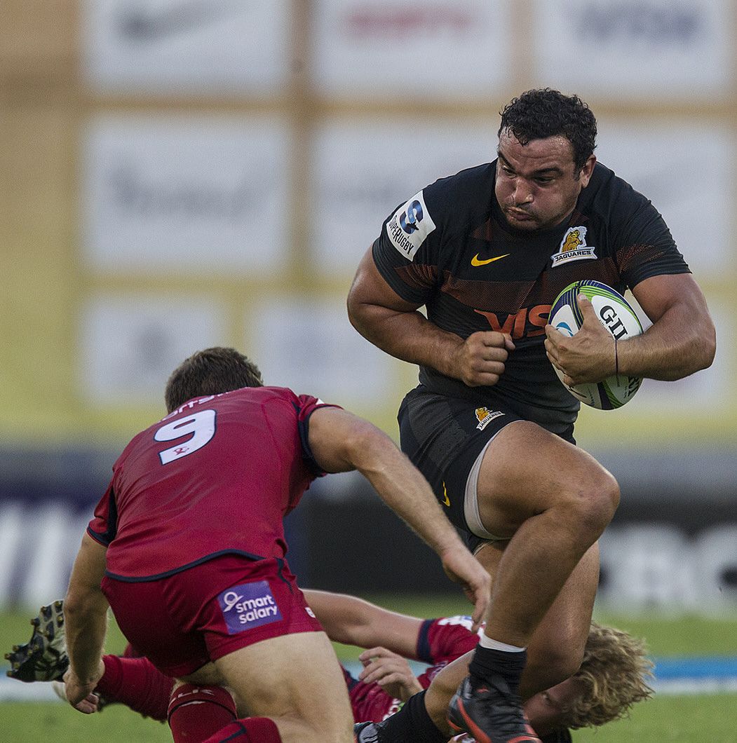 Pura potencia. El capitán de Jaguares, Agustín Creevy, arremete con toda su fortaleza ante la marca de un adversario de Reds.