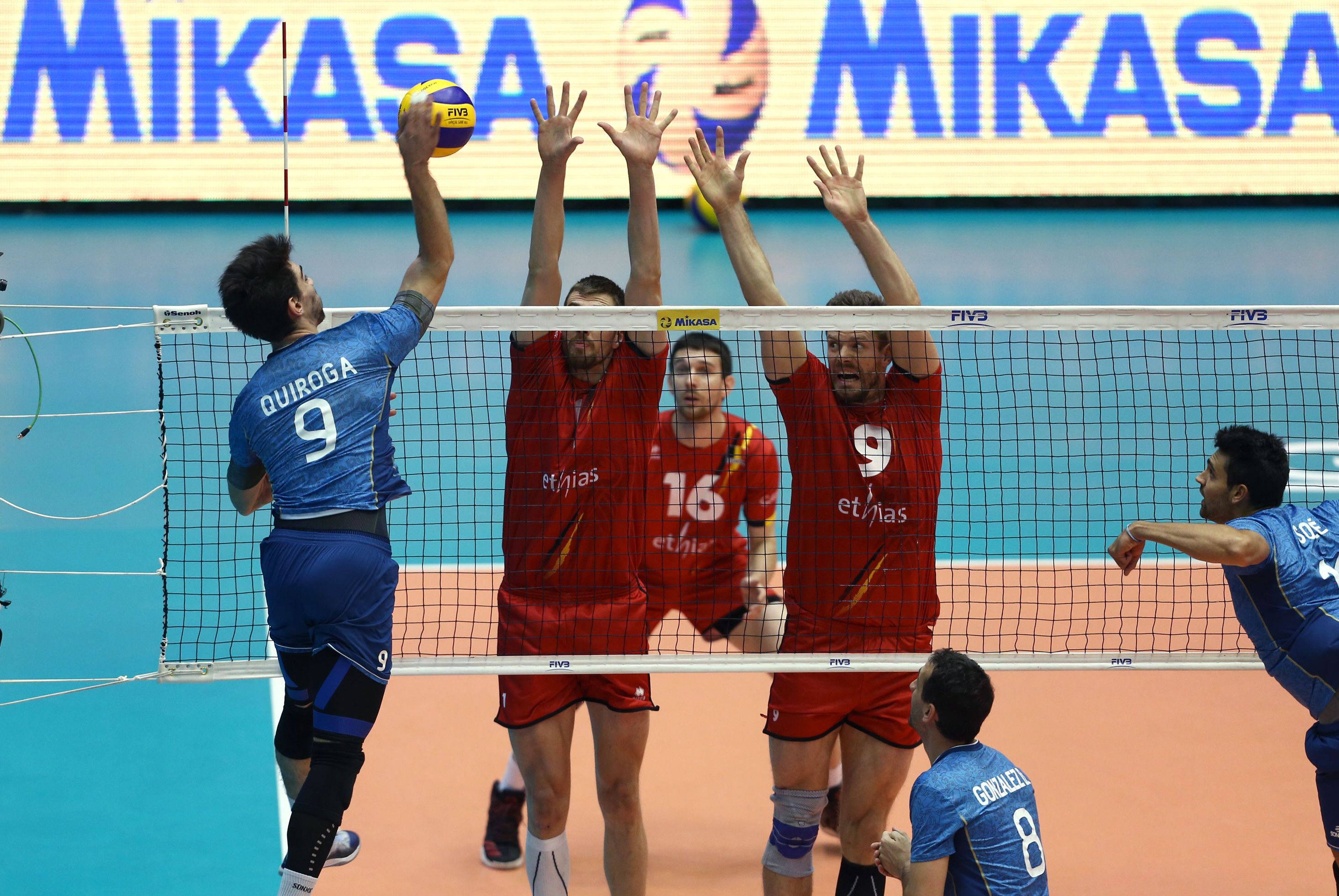 El equipo nacional, que había perdido el viernes 0-3 contra Serbia, cayó con parciales de 23-25, 25-20, 25-23, 24-26 y 15-6. El zurdo Santiago Darraidou fue el máximo anotador del encuentro con 23 puntos. Mientras que el sanjuanino Gonzalo Quiroga fue titular y aportó 17 puntos. En tanto, Alejandro Toro ingresó como relevo y contribuyó con 3 puntos.