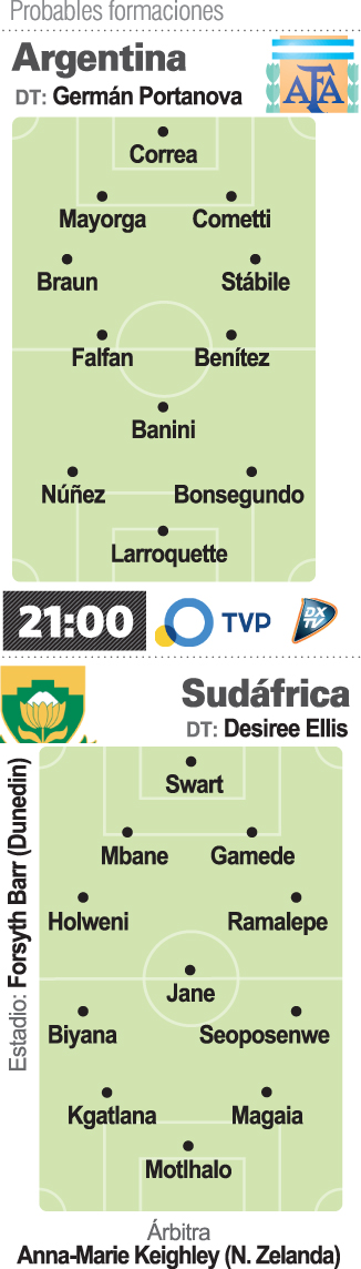 Portanova no dio señales de la formación inicial para enfrentar a las sudafricanas, aunque no se esperan demasiados cambios. El equipo terminó con cuatro amonestadas en el choque ante las italianas: Mariana Larroquette, Miriam Mayorga, Florencia Bonsegundo y Eliana Stábile.