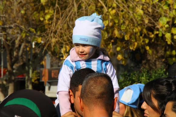 San Juan, 21 de junio.- Decenas de sanjuaninos se acercaron esta tarde hasta Plaza 25 de Mayo para celebrar la sufrida victoria de Argentina frente a Irán, con gol de Messi en el último suspiro del partido.