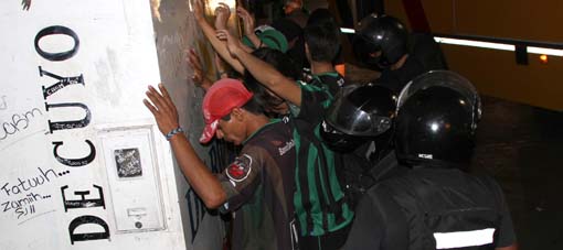 San Juan, 27 de septiembre.- Tal como ocurrió el año pasado, algunos hinchas de San Martín protagonizaron disturbios tras los festejos por un nuevo aniversario. Según los primeros datos, son más de 40 los detenidos, la mayoría jóvenes que rompieron una vidriera y atacaron un kiosco de diarios y revistas.
