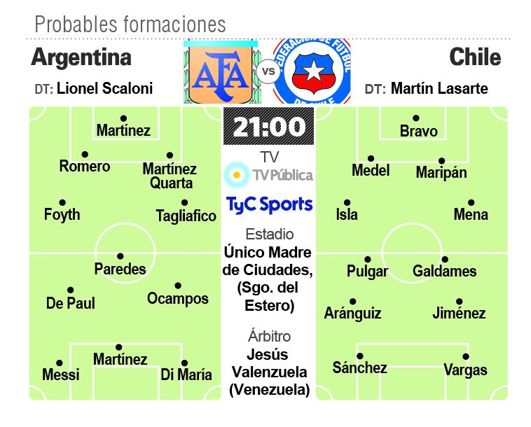 Chile tendrá el debut oficial del entrenador Martín Lasarte, que sólo dirigió al equipo en un amistoso ganado ante Bolivia y que reemplaza en el cargo al colombiano Reinaldo Rueda. El plantel de la "roja" ya se encuentra en Santiago del Estero.