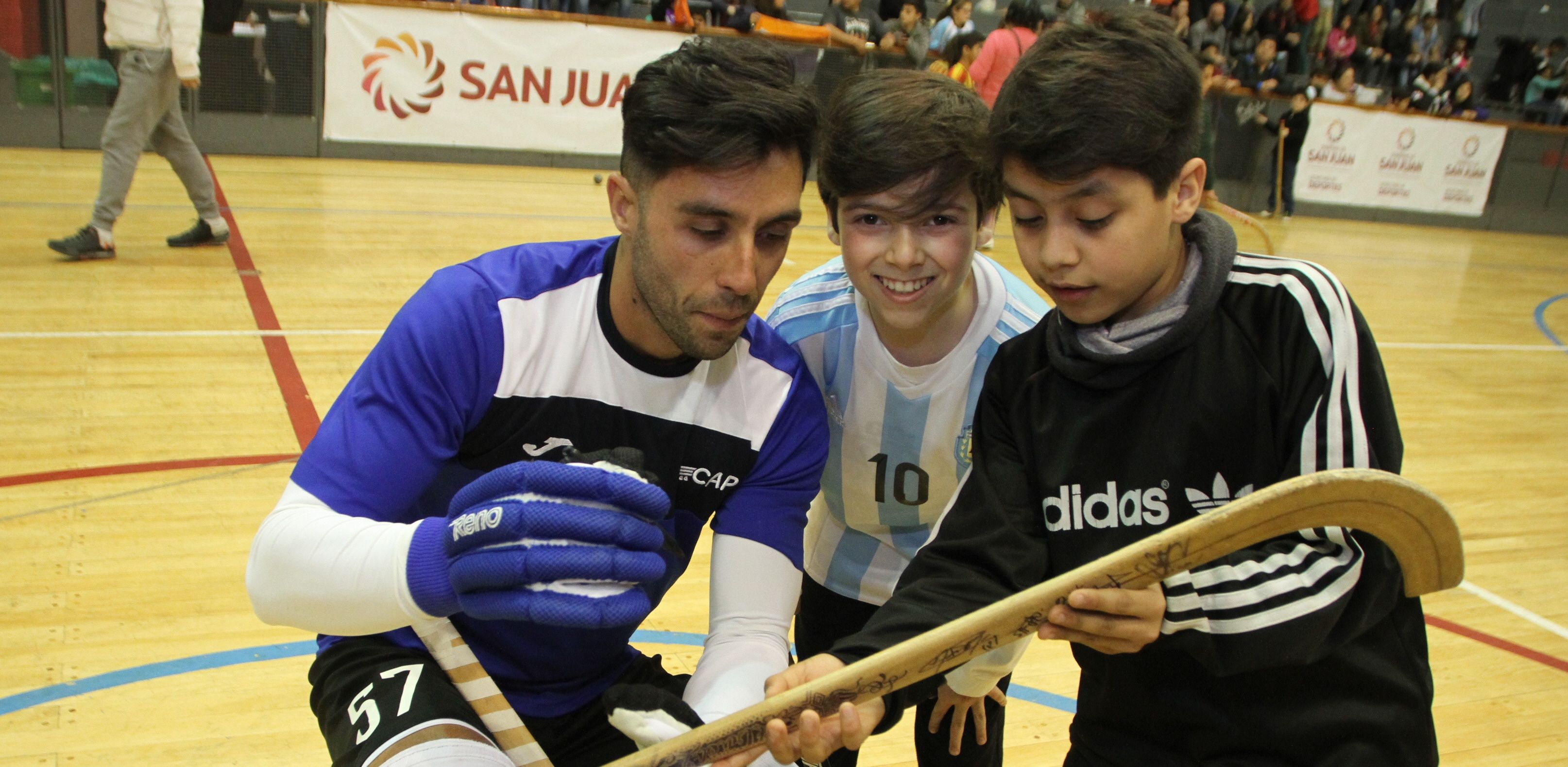 Apenas el locutor anunció que los pequeños podían ingresar al parquet a saludar a los jugadores, él corrió para abrazarlo y en esos minutos nunca se despegó de su ídolo. Se trata de Benjamín Videla, un pequeño de 9 años que padece una cardiopatía congénita y que producto de eso tuvo que dejar de practicar hockey. Del otro lado está Pablo Gómez, uno de los arqueros de la Selección argentina y su máximo referente.