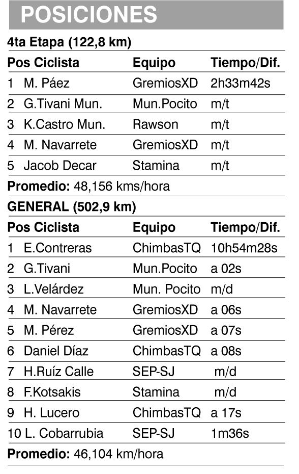 El cuarto capítulo del II Grand Prix del Pedal Club Olimpia se convirtió en el primer parcial donde no hubo cambio de malla líder. Al tramo de 122,8 kilómetros, que se definió en embalaje masivo, lo ganó el mendocino Mauricio Páez, escoltado por Gerardo Tivani (Municipalidad de Pocito) que es de los hombres que venían en el grupo de punta en la general, quien más avanzó porque con los seis segundos que ganó de bonificación, quedó a 2 segundos -al igual que su compañero Leandro Velárdez- de Emiliano Contreras (Chimbas Te Quiero). Otro habría sido el cantar si el capitán del equipo de la Municipalidad de Pocito se imponía en la etapa corrida íntegramente en su tierra, porque habría bonificado 4s más, diferencia que le habría alcanzado para saltar el frente.
