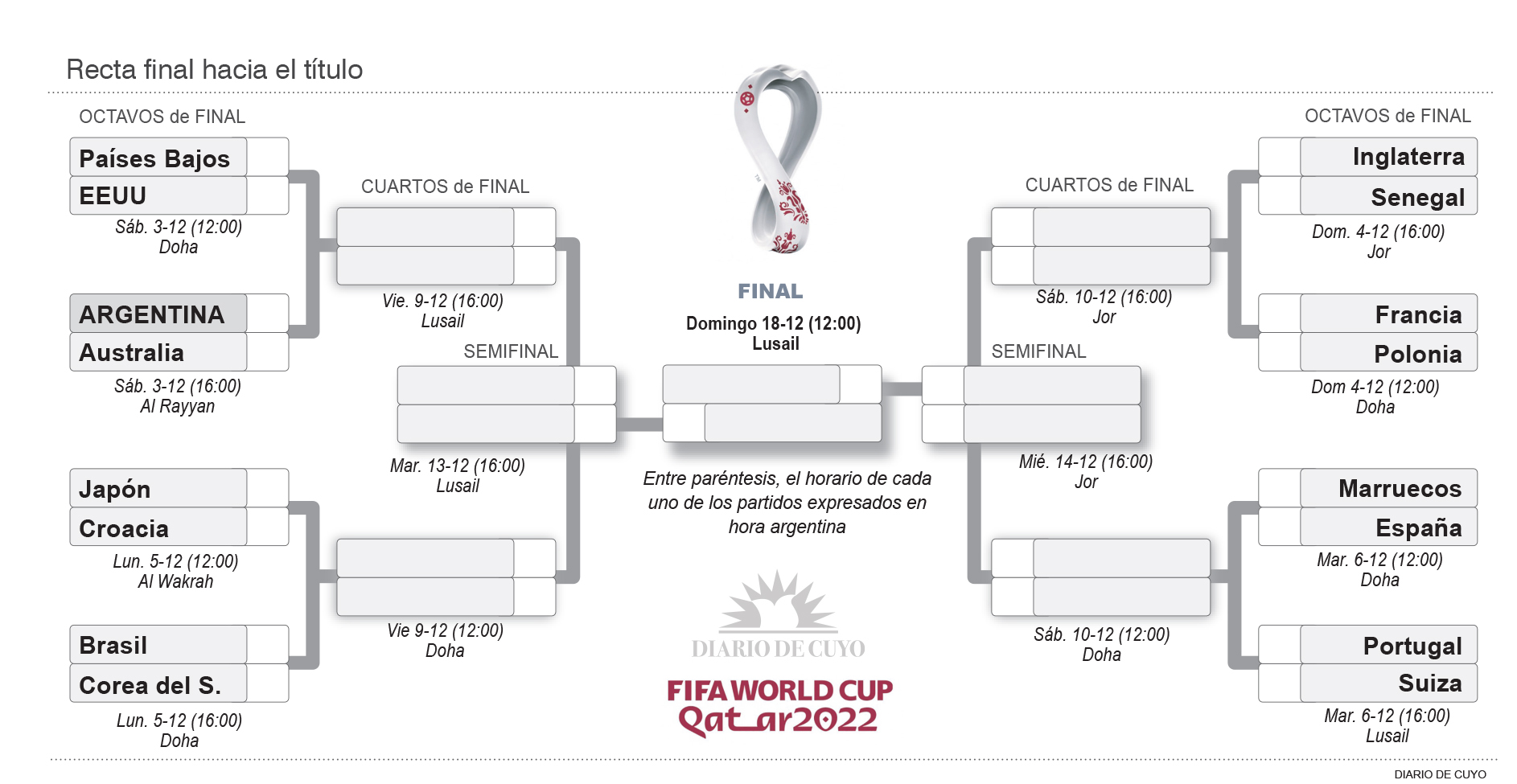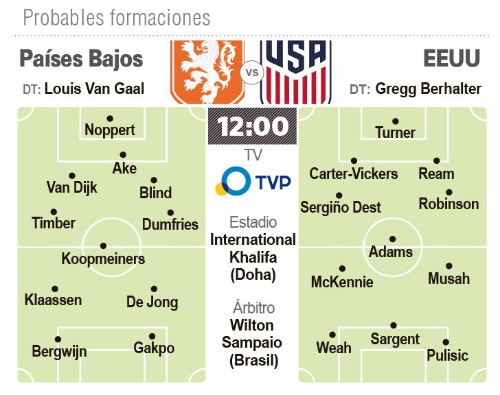 Los seleccionados de Países Bajos, tres veces subcampeón mundial, y Estados Unidos, jugarán hoy el primer cruce de los octavos de final de la Copa del Mundo de Qatar, cuyo ganador tendrá como rival en cuartos de final al vencedor de la eliminatoria entre Argentina y Australia. El partido se jugará hoy a partir de las 12 (hora de la Argentina) en el Estadio International Khalifa, en Doha, con el arbitraje del brasileño Wilton Sampaio. A partir de estas instancias con enfrentamientos mano a mano, en el caso de empate al término de los 90 minutos se recurrirá a un tiempo suplementario de 30 minutos y de mantenerse la igualdad el vencedor se decidirá mediante remates desde el punto penal. Países Bajos culminó primero en el Grupo A tras haber vencido a Senegal (2-0) y Qatar (2-0), y de haber empatado con Ecuador (1-1). Estados Unidos, en tanto, fue segundo en el Grupo B al empatar con Gales (1-1) e Inglaterra (0-0) y vencer a Irán (1-0).