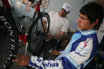 Ayer, después de una sesión de masajes, "Pájarito" estuvo en el taller de Ernesto "Pollito" Fernández, terminando de acondicionar su bicicleta. Una Privitera totalmente de carbono, que llevará llantas de alto vuelo y tendrá tubos marca Tufo, que llevan un líquido para evitar las pinchaduras.