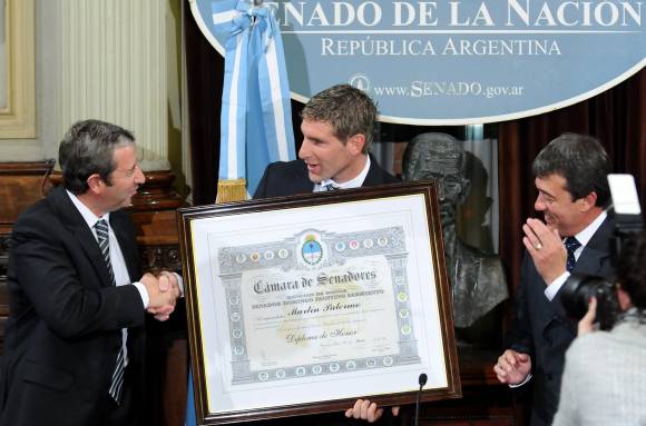 Martín Palermo recibió ayer la mención de honor “Senador Domingo F. Sarmiento” en reconocimiento a su obra destinada a mejorar la calidad de vida de la comunidad. Palermo apadrina la fundación “SOS Infantil”, dedicada desde 1989 a promover los derechos de niños, niñas y adolescentes de escasos recursos, colabora con campañas de entidades como Unicef, “Comprometerse más” y la organización Fundaleu, dedicada a asistir a pacientes con enfermedades oncológicas de la sangre. El acto se realizó en el Salón Arturo Illia, del Congreso de la Nación, y fue encabezado por el vicepresidente Julio Cobos. Palermo concurrió acompañado por su hermano y sus padres y luego compartió una cena en el comedor de la Cámara Baja.