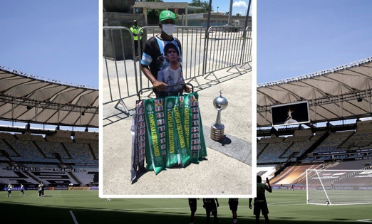 La final en el mítico Maracaná recibió a 2.500 hinchas, pese a la pandemia del coronavirus. En los alrededores del estadio, varios vendedores ambulantes ya palpitaban la previa del encuentro. Carteles, banderas, bufandas y hasta réplicas de la misma Copa Libertadores se venden a los fanáticos. Y cómo no podía ser de otra forma, Diego Maradona (foto) está presente. Un vendedor se puso una remera con la cara del diez argentino para atraer a más hinchas del fútbol.