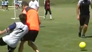 En un ambiente risueño, el referí fue a marcar al pobre chico con la número 7 en la espalda y no le dio chance: lo enganchó de atrás y lo hizo volar por el aire, con muletas y todo.