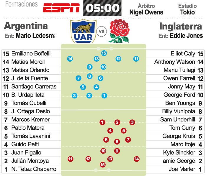 Inglaterra es superlativo en lo técnico y físico. Tiene un medio apertura notable en George Ford, hace todo bien y es excelente jugando con los pies, una defensa que es un muro y un scrum que es de los mejores del mundo. Además, los ingleses son contundentes pateando a los palos ya sea con Ford (10 puntos ante Estados Unidos) u Owen Farrell (15 ante Tonga) y cuentan con dos notables extranjeros, el tercera línea australiano Billy Vunipola y el centro samoano Manu Tuilagi.