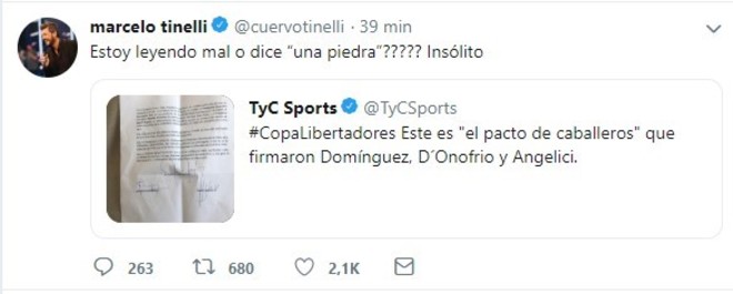 En otro tuit, el vice del Ciclón se preguntó como puede ser que se analice jugar el encuentro reprogramado para este domingo: "¿¿¿Realmente se puede jugar hoy, con un jugador en el Sanatorio a cinco horas del “comienzo” del partido??? Cadena de despropósitos". Y también se tomó con ironía el papel que se viralizó con el pacto de caballeros firmado por los presidentes para jugar el encuentro este domingo: "¿Estoy leyendo mal o dice “una piedra”? Insólito".