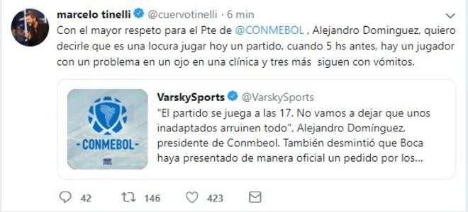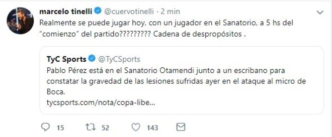 El bochorno que se vivió con la llegada del micro de Boca al Monumental y obligó la suspensión del partido fue el tema al que se refirieron todos en las últimas horas. Y Marcelo Tinelli, vicepresidente de San Lorenzo, se refirió a esta cuestión vía Twitter. "Con el mayor respeto, para el presidente de Conmebol, Alejandro Domínguez, quiero decirle que es una locura jugar hoy un partido, cuando cinco horas antes hay un jugador con un problema en un ojo en una clínica y tres más siguen con vómitos", publicó el Cabezón.