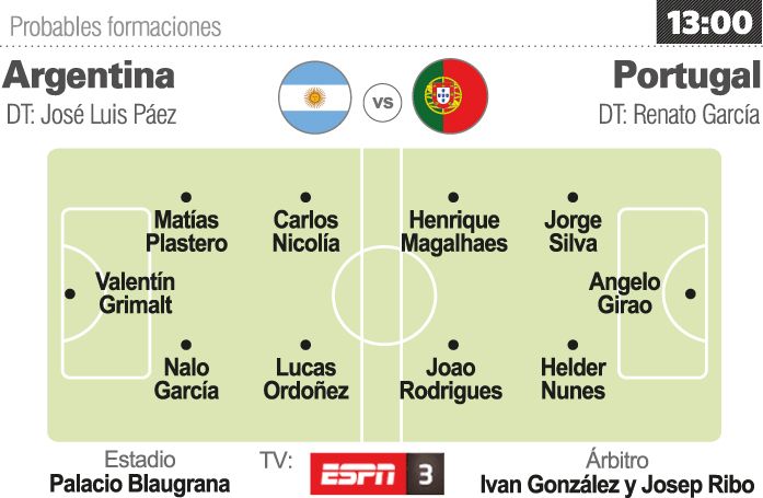 Justamente ese será el rival de hoy: Portugal. Ese equipo lusitano que ha ido creciendo a medida que avanzó el Campeonato. Ese equipo que empató con la Argentina en este mismo torneo (en la fase clasificatoria). Ese equipo que antes de ayer eliminó sorpresivamente al local España. El choque decisivo será en el "Palau Blaugrana" del Barcelona. Desde las 18 hora local (13 de la Argentina y por ESPN 3).