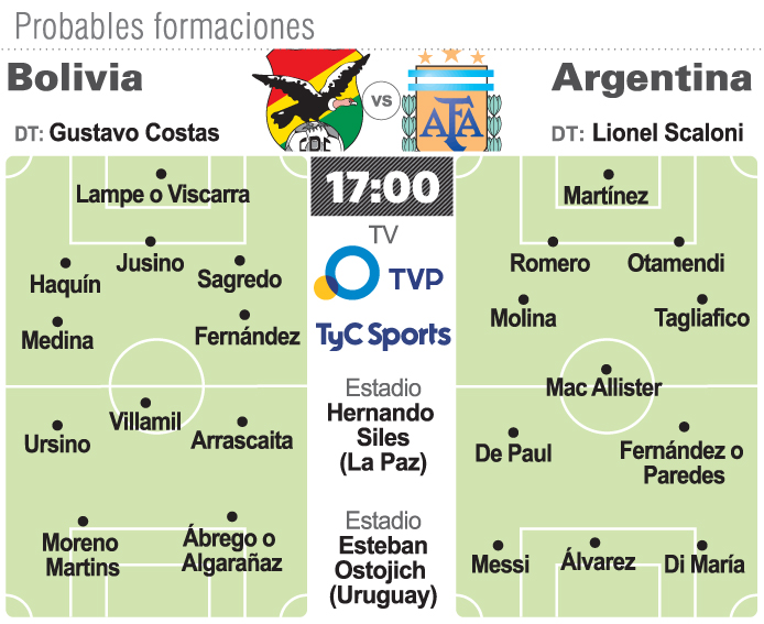 El seleccionado argentino, con su capitán Lionel Messi, enfrentará hoy a Bolivia, dirigida por Gustavo Costas, en la altura de La Paz, por la segunda fecha de las Eliminatorias Sudamericanas para el Mundial 2026.