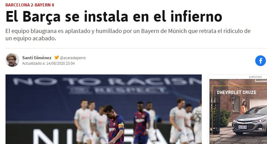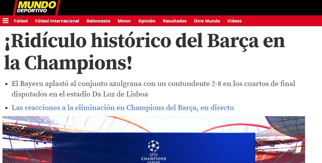 "Acaba la peor pesadilla de la historia del Barça. 2-8. No hace falta ni describirlo, el resultado habla por si solo. Ojo los próximos días porque puede haber cosas muy muy sonadas", agregó Sport en lo que fue su crónica "minuto a minuto" del choque.