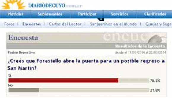 DIARIO DE CUYO ONLINE realizó un sondeo con la siguiente consigna: ¿Creés que Forestello abre la puerta para un posible regreso a San Martín? De la encuesta participaron 564 personas, de las cuales el 78,2% opinó que el técnico quiere regresar a la entidad a la que casi salvó del descenso en junio del 2013. En tanto que el restante 21,8% no cree que Forestello haya abierto una puerta para un posible regreso con sus declaraciones.
