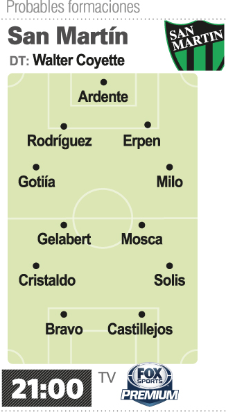 En lo futbolístico, el técnico Walter Coyette utilizará su cuarta formación distinta en su cuarto partido de la temporada y es que su decisión es incluir a Gonzalo Castillejos como titular en lugar de Pablo Palacios Alvarenga. Este será el único cambio que presente San Martín ya que el resto mantendrá nombres y esquema, tras el empate 2-2 frente a Tigre en Victoria, el sábado pasado. Así, San Martín irá con su capitán Luis Ardente en el arco. El fondo se repite con Goitía, Juan Rodríguez, Erpen y Milo; Cristaldo, Gelabert, Mosca y Solis en el mediocampo más Bravo -goleador- con Castillejos que debutará de titular en la Superliga.