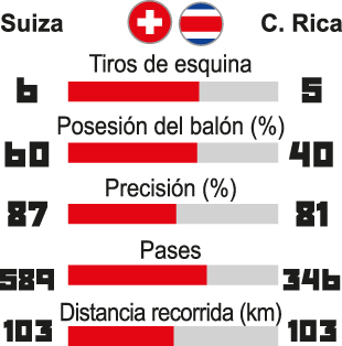 Fueron los "ticos" -ya eliminados- quienes iban buscando el mejor cierre, pero si bien dominaron Suiza pegó primero con el gol de Dzemaili. Recién en el complemento, de pelota parada, Kendall marcó la igualdad. Y cuando ambos parecían conformarse con el 1 a 1, Drmic anotó el 2 a 1 para Suiza y a instantes del final Sommer en contra le dio la igualdad a los centromericanos quienes dejaron una marca en este Mundial por su entrega.